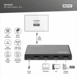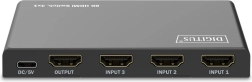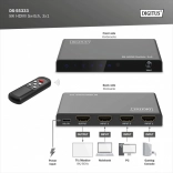 Az elegáns és kompakt DIGITUS 3×1 HDMI kapcsoló akár három HDMI forrást is egyetlen kijelzőhöz csatlakoztat. Ideális fali TV-khez, játékkonzolokhoz, lejátszókhoz vagy számítógépekhez – elegendő egyetlen HDMI-kábel a képernyőhöz, a források között pedig távolról válthat.