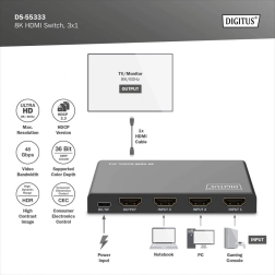 Bővítse televízióját vagy monitorát további HDMI bemenetekkel, és váltson az eszközök között kábelek cseréje nélkül. A DIGITUS 3×1 HDMI kapcsolója akár 8K/60 Hz (4:4:4) felbontást, HDR és HDCP 2.3 támogatást kínál. A tápellátás kényelmesen USB‑C-n keresztül történik, a vezérlést pedig távirányító vagy az utoljára aktív forrás automatikus átváltása biztosítja.