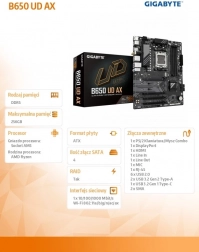A GIGABYTE B650 UD AX alaplap AM5 foglalathoz stabil tápellátást, AMD Ryzen 7000/8000/9000 támogatást, gyors DDR5 memóriát és villámgyors M.2 PCIe 5.0/4.0 tárhelyet kínál. Emellett rendelkezik Wi‑Fi 6-tal, GbE LAN-nal, modern HDMI/DP és 10 Gb/s USB csatlakozókkal, valamint hasznos funkciókkal, mint az EZ‑Latch, a Q‑Flash Plus és a Smart Fan 6 a könnyű építéshez és a megbízható működéshez.