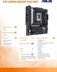 Az ASUS TUF GAMING B860M‑PLUS WIFI az Intel B860 chipkészletre épül, robusztus tápellátással, minőségi hűtéssel és hosszú élettartammal. A DDR5 akár 8800 MHz és a legfeljebb 256 GB memória támogatásának köszönhetően zökkenőmentes futást nyújt a nagy igényű játékoknál, a multitaskingnál és a kreatív alkalmazásoknál.