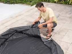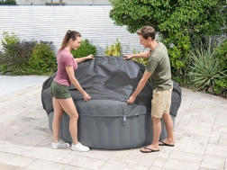 A szerelés gyors és intuitív. Az állítható, körbefutó pánt biztonsági csatokkal stabil rögzítést ad, míg az integrált cipzár lehetővé teszi a szivattyú gondtalan csatlakoztatását a fedél eltávolítása nélkül. A fedél kompatibilis a Lay‑Z‑Spa St. Moritz, Monaco, Santorini HydroJet Pro és más, 216 cm átmérőjű, kerek pezsgőfürdőkkel.
