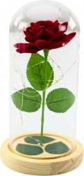Ez az örök piros rózsa élethűen utánozza a valódi virágot, és az üveg búra révén megőrzi időtlen megjelenését por és karbantartás nélkül. A meleg LED háttérvilágítás kiemeli a kompozíció szépségét, és otthonát meghitt, romantikus hellyé varázsolja.