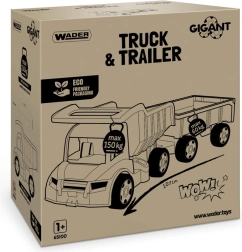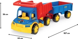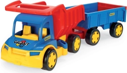 Ez az óriási teherautó pótkocsival ideális minden kis teherautó-szerető számára. Nagy és masszív felépítése tartósságot és szórakozást biztosít hosszú évekig. A csatlakoztatható vonórúd révén a gyerekek könnyen húzhatják az autót, és használhatják játékok vagy más tárgyak szállítására. Szórakozás és tanulás egyben; a teherautó serkenti a gyerekek képzelőerejét, javítja a kézügyességet és támogatja a szem-kéz koordinációt. Kiválóan alkalmas otthoni és szabadtéri játékra is.