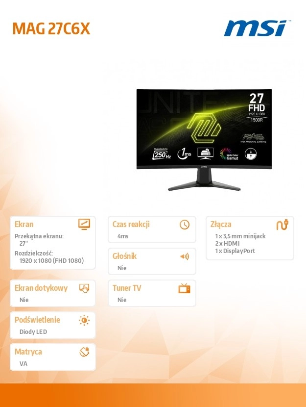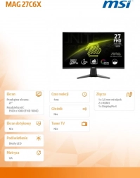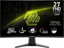 Elegáns 27″ ívelt MAG 27C6X monitor FHD felbontással, amely zökkenőmentes képet kínál a 250 Hz-es frissítési frekvenciának és a LED technológiának köszönhetően. Az ívelés a jobb beleélésért, gyors válaszidő játékhoz és fekete kivitel, amely illik a modern setuphoz.
