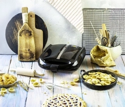Az akár 1600 W teljesítmény egyenletes hőelosztást biztosít, a jelzőfény tájékoztat a sütésre kész állapotról, a masszív bakelit ház és a hőszigetelt fogantyúk pedig a kényelmes és biztonságos használatról gondoskodnak. A fedélretesz szorosan összetartja a formákat az egyenletes átsülésért.
