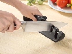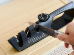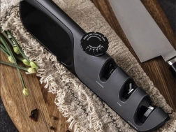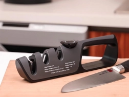 Állítható 14–24° élszögű késélező, 3 fokozat, késekhez és ollókhoz