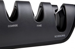 Három különálló nyílás biztosítja a helyes sorrendet: éljavítás (Coarse), simítás és polírozás (Fine), valamint az olló precíz élezése (Scissors).