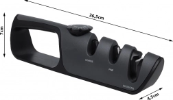 Az ergonomikus fogantyú és a csúszásmentes talp stabilan a helyén tartja az élezőt. A 26,5 × 4,5 × 7 cm-es kompakt méret minden konyhába illik.