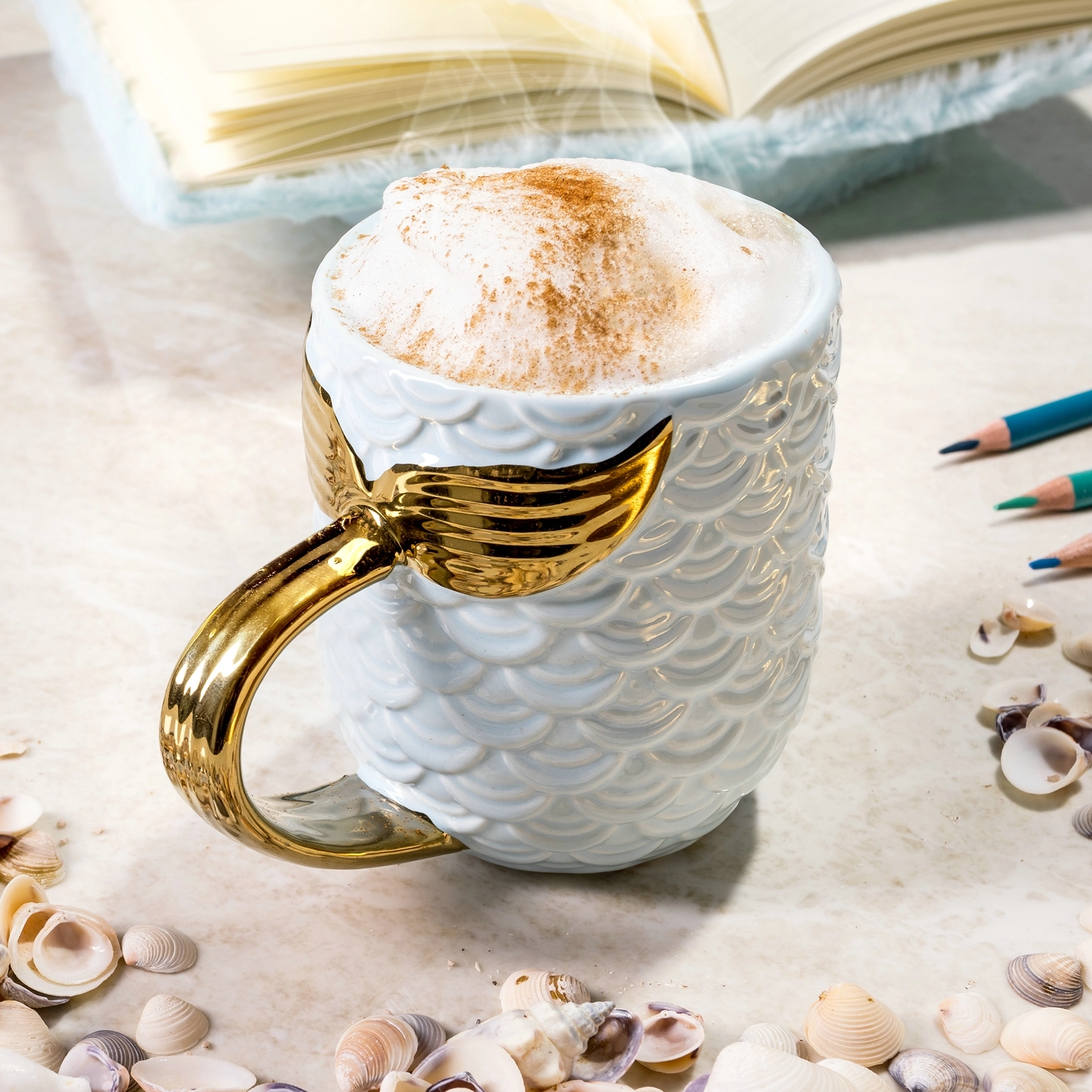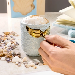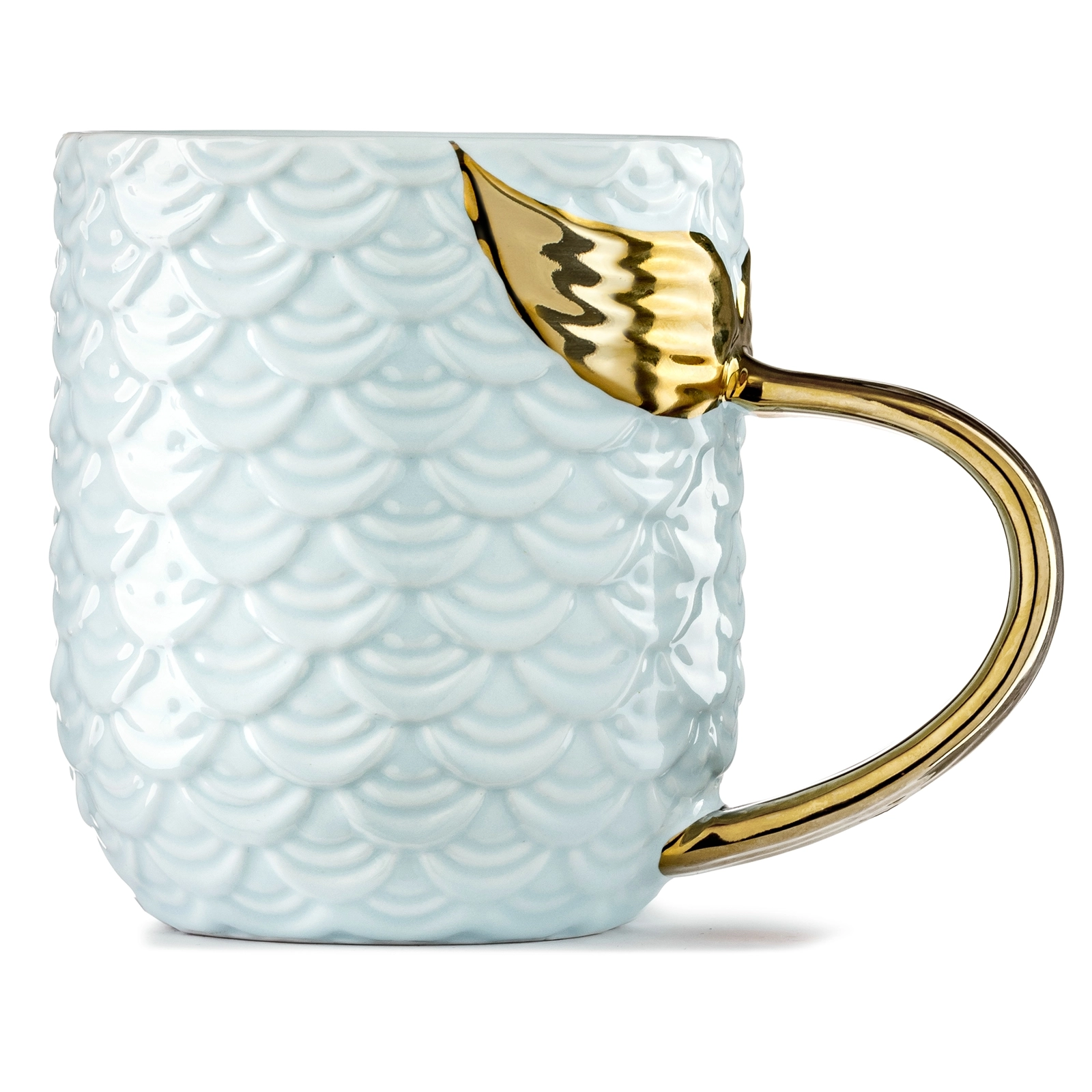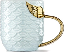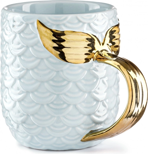 Tapasztalja meg a tenger alatti álmokat ezzel a mesés sellős bögrével! A bögre kék, pikkelymintás kialakításának és az aranyozott, sellőfarok alakú fogantyújának köszönhetően minden korty varázslatos élményt nyújt.