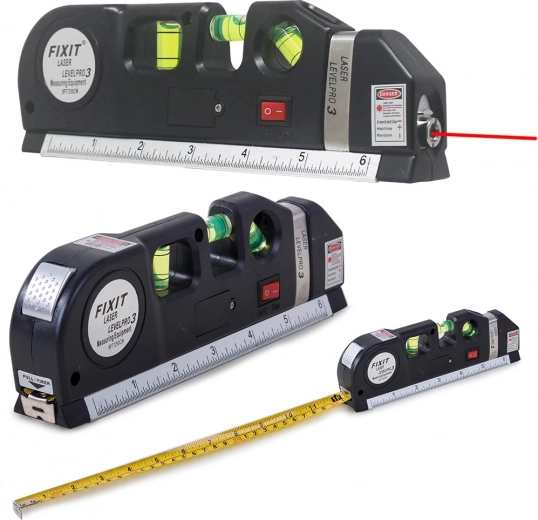 A lézeren felül a készülék 15 cm-es szabványos mérőt és 250 cm-es kihúzható mérőszalagot is tartalmaz, cm, hüvelyk és láb beosztással. A tökéletesen pontos méréshez a vízmérték 3 libellával és olyan funkciókkal rendelkezik, mint a mérés rögzítése és az automatikus visszahúzás.