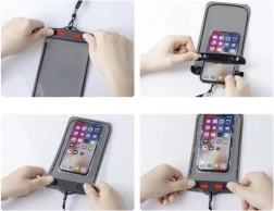 A dupla zár biztosító mechanizmussal szoros zárást nyújt, hogy nyugodt lehessen fürdés, úszás vagy vízi sportok közben. A praktikus nyakpánt/zsinór révén a telefon mindig kéznél és védve van. A tok ideális nyaralásra, uszodába, SUP-ozáshoz, kajakozáshoz és városi esőben is.