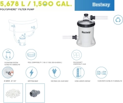 Főbb jellemzők:- Teljesítmény: A 5678 l/óra átfolyású szivattyú segít eltávolítani az úszó szennyeződéseket a medencéből.