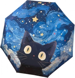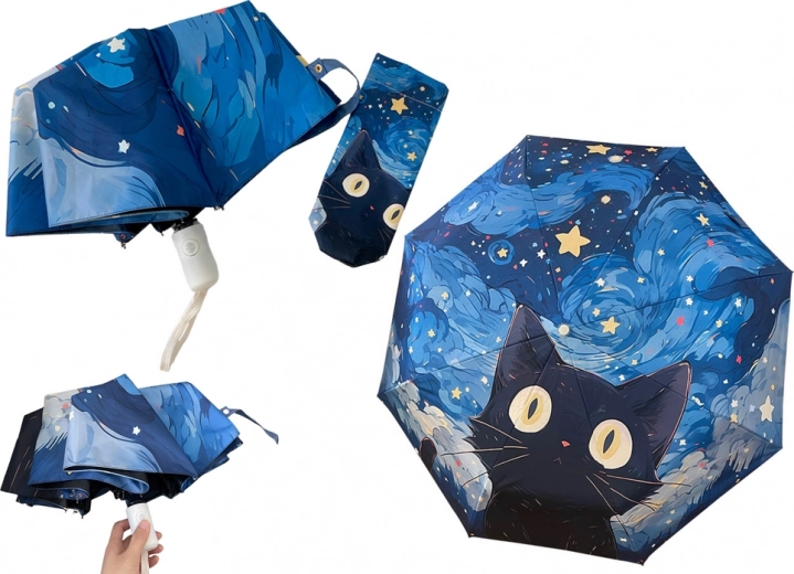 Az automata összecsukható esernyő tökéletes választás mindennapi használatra és utazáshoz. Masszív, mégis könnyű szerkezetének köszönhetően hosszú élettartamot és erős széllökésekkel szembeni ellenállást biztosít. Egyedi dizájnja, a kék ég hátterén ábrázolt fekete macska motívum, garantáltan magára vonja a figyelmet.