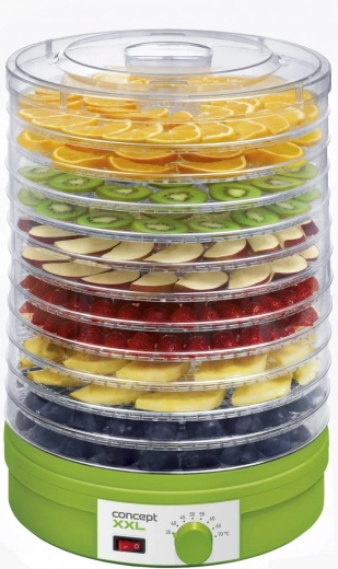 A Concept élelmiszer szárító kiváló megoldást nyújt az élelmiszerek eltarthatóságának meghosszabbítására anélkül, hogy azok tápláló értékei csökkennének. XXL méret 12 tálcával lehetővé teszi nagy mennyiségű szárított zöldség és gyümölcs készítését a téli hónapokra. Ennek eredményeként ízletes levesek vagy egészséges kompótok készülhetnek, melyekkel az egész család elégedett lesz. Praktikus karbantartás - a szárító kialakítása a lehető legkényelmesebb tisztítást teszi lehetővé, a tálcák mosogatógépben is tisztíthatók. Egységes szárítás biztosított a beépített ventilátorral és speciálisan kialakított szellőzőnyílásokkal, amelyek kiváló eredményeket garantálnak a szárító minden szintjén.