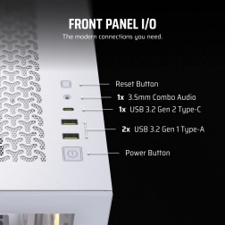 Az elülső panel USB 3.2 Gen 2 Type-C, két USB 3.2 Gen 1 Type-A portot, valamint kombinált audió és mikrofon bemenetet tartalmaz.