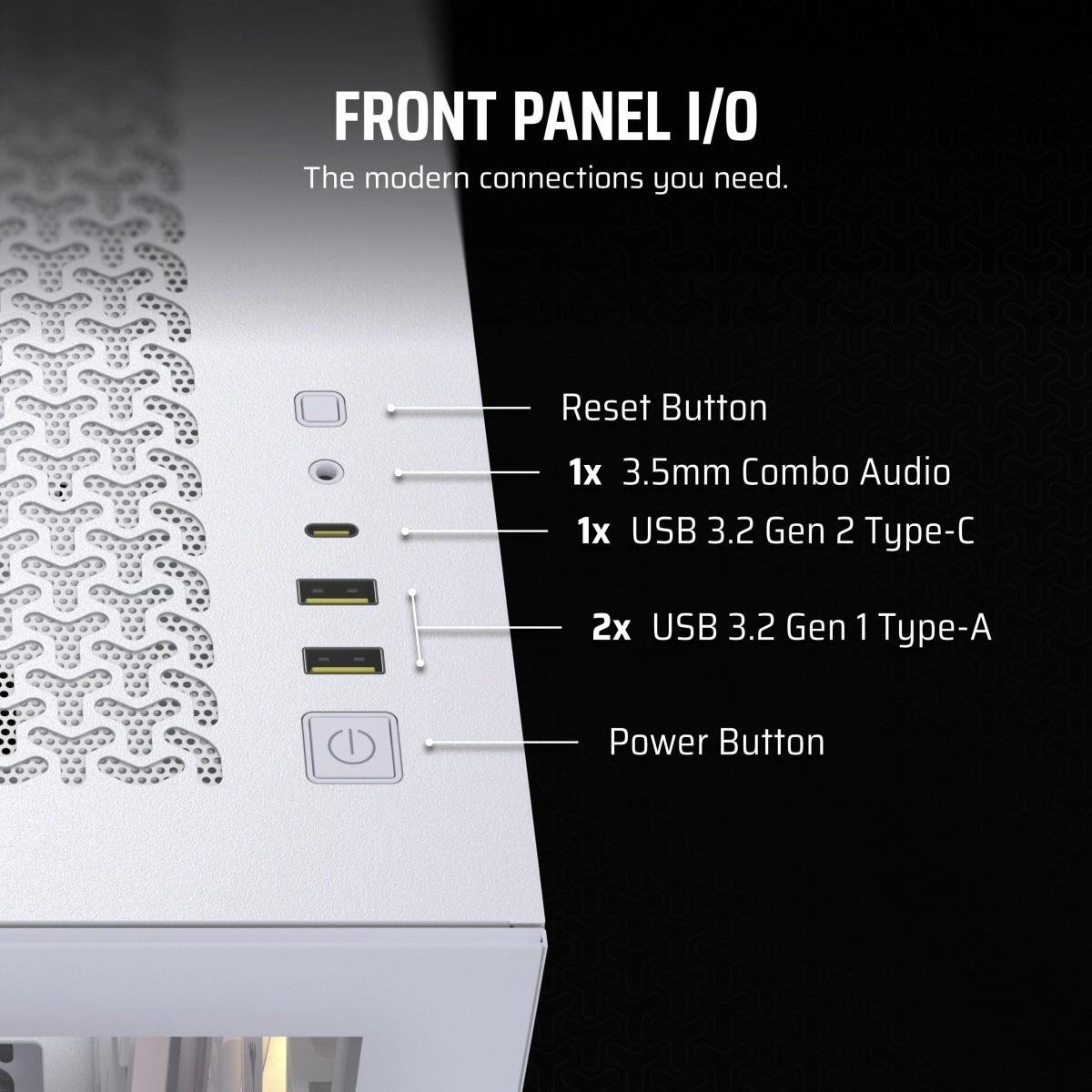 Az elülső panel könnyű hozzáférést biztosít az USB 3.2 Gen 2 Type-C, USB 3.2 Gen 1 Type-A portokhoz és a kombinált audió/mikrofon bemenethez.