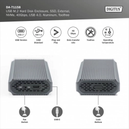 A merevlemez burkolat magas kompatibilitást kínál különféle M.2 formátumú modulokkal (2230, 2242, 2260 és 2280), és maximális 8 TB kapacitással, ami bőséges helyet biztosít minden fájl és adat számára. Az USB 4.0 technológia révén gyors, 40 Gb/s sebességű adatátvitel érhető el, ami sima munkát és hatékony fájlátvitelt jelent.