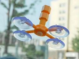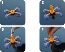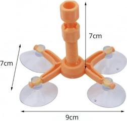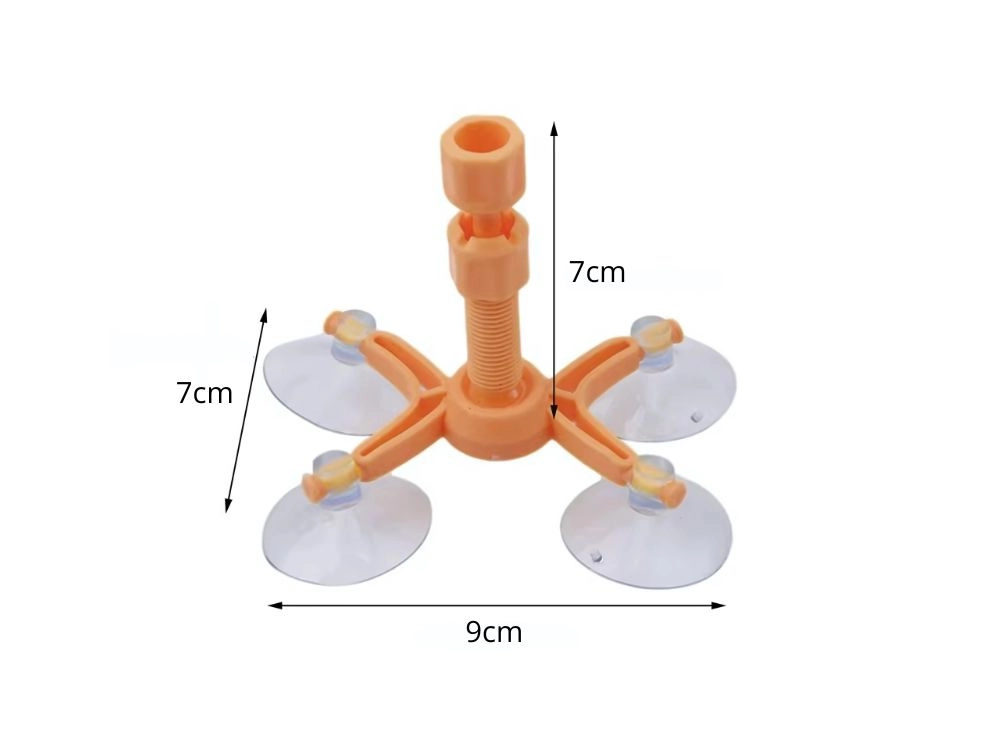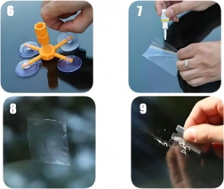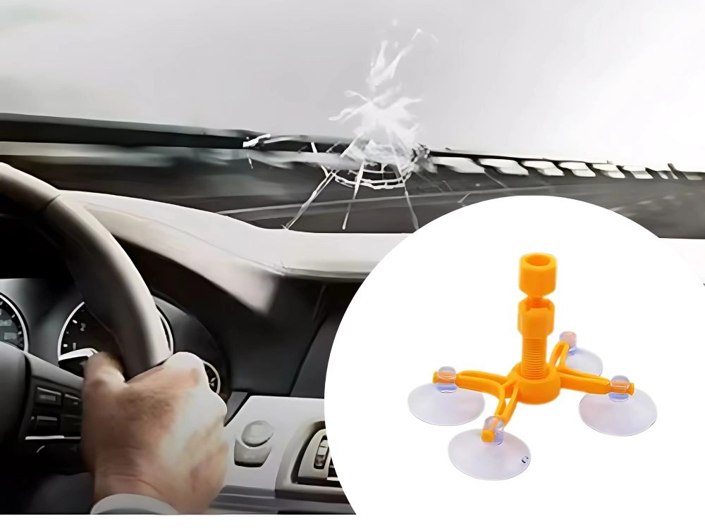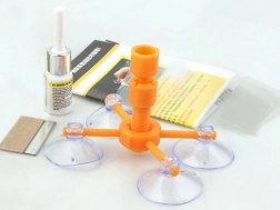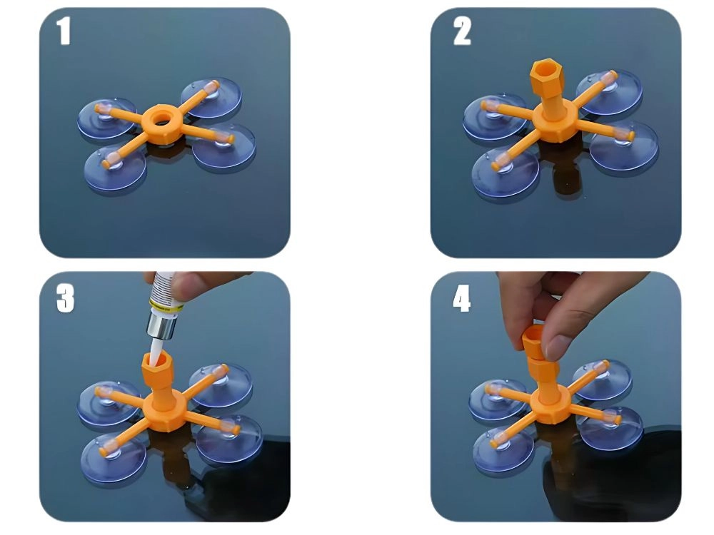 A narancssárga állvány négy tapadókoronggal erősen rögzül az üveghez, és pontosan a sérülés fölé igazítja az injektort, így a gyanta mozdulás nélkül tölti ki a repedést.