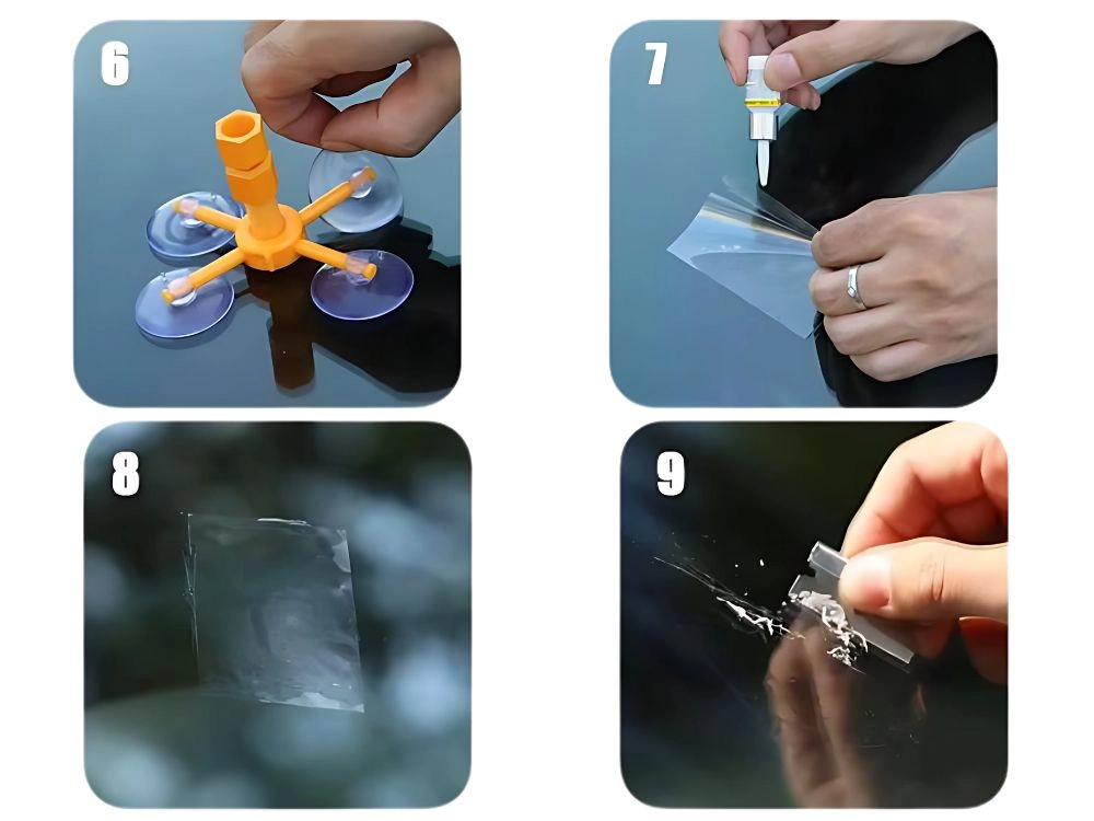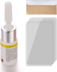 Az eljárás egyszerű: tisztítsa meg az üveget, rögzítse az applikátort, fecskendezze be a gyantát, szorítsa ki a levegőt, fedje le fóliával, majd keményítse napfényen vagy UV-lámpával. A készlet ideális önálló felhasználásra, és minden gondos autós könnyedén elboldogul vele.