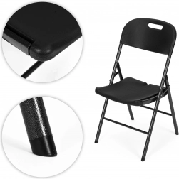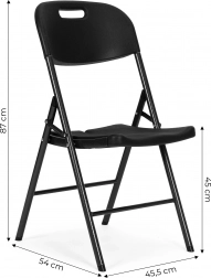 A székek egyetlen mozdulattal összecsukhatók, így gyorsan és könnyedén készíthet ülőhelyet több vendég számára. A fém váz porszórt festékkel van bevonva, hogy ellenálljan az időjárás viszontagságainak. A lábakra szerelt védősapkák megakadályozzák a padló karcolódását és biztosítják a szék stabilitását.