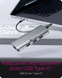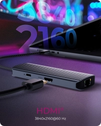 6 az 1-ben asztali dokkoló állomás ideális megoldás munkához és utazáshoz, számos csatlakozási lehetősége van USB Type-C-n keresztül. Támogatja a 4K kijelző kimenetet és megbízható kapcsolódást biztosít gigabites Etherneten keresztül.