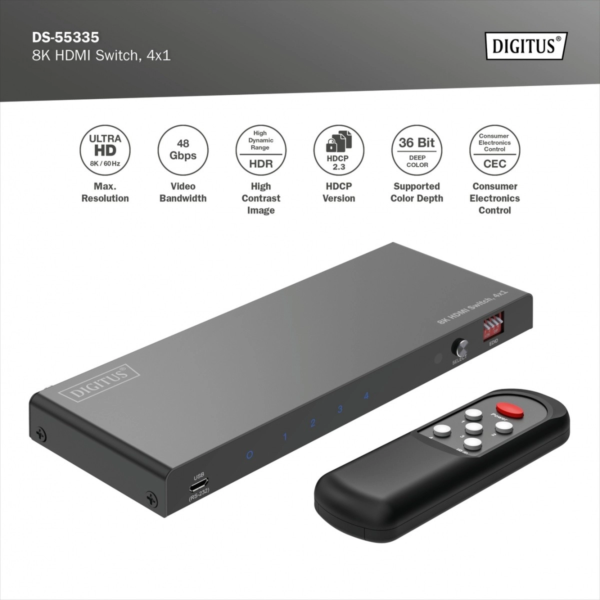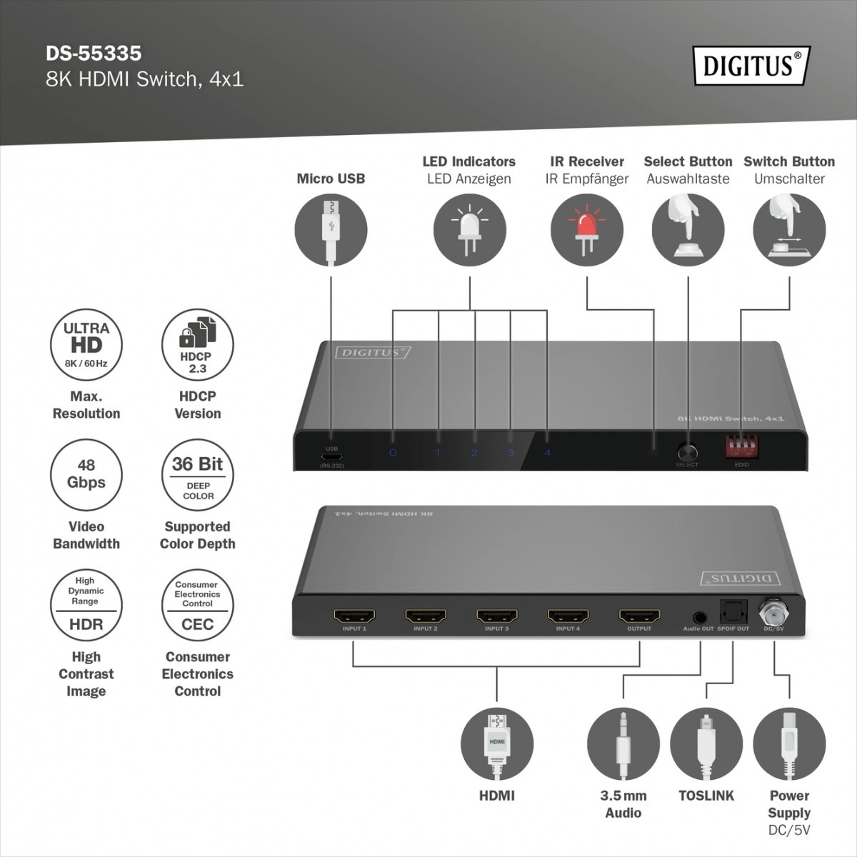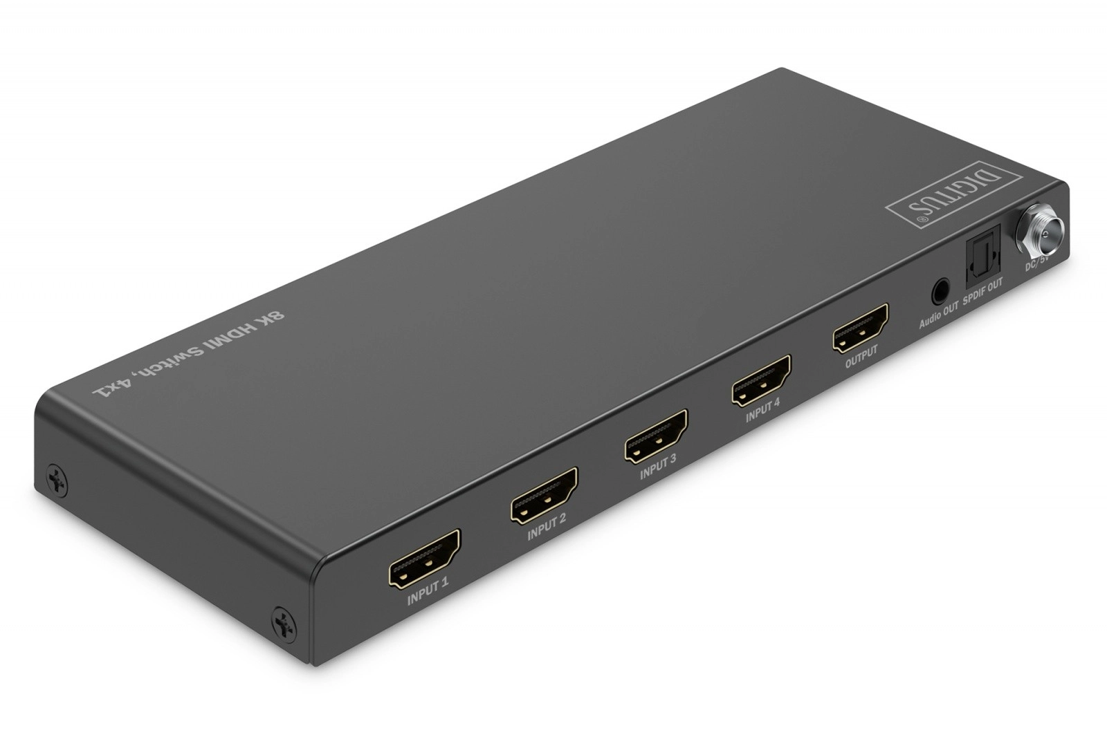 Digitus 8K HDMI kapcsoló, 4x1 négy további HDMI bemenetet biztosít monitorjának vagy televíziójának, lehetővé téve a különböző források kényelmes csatlakoztatását egyetlen HDMI kimenettel. Az audiojelek elkülöníthetők Toslink vagy sztereó kimenettel, és külön lejátszhatók.