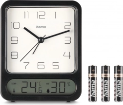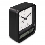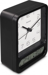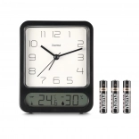 Ez a stílusos ébresztőóra a klasszikus megjelenést modern funkcionalitással ötvözi. A nagy, fehér, kontrasztos felületű analóg számlap arab számokkal kiváló olvashatóságot biztosít, míg az alsó digitális kijelző folyamatosan mutatja a hőmérsékletet és a páratartalmat a helyiségben. Így egy praktikus otthoni időjárás-állomást és megbízható időmérőt kap egyben.