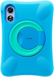 A támasz és a fogantyú biztosítják, hogy a tablet könnyedén fogható és stabil. A tok megvédi az eszközt az ütésektől, és élénk színekben, kék és türkiz színben kapható. A fogantyún látható az 'OUKITEL' márka logója.