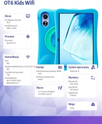 A gyermekek biztonságát és kényelmét szem előtt tartva terveztük gyermek tabletünket. Ellenálló tok védi a tabletet az ütésektől és esésektől. A gyerekek könnyedén hordozhatják a tabletet a hátlapon található praktikus fogantyú segítségével. A dupla kamerás rendszer lehetővé teszi számukra, hogy fotókat és videókat készítsenek, ami növeli kreativitásukat.