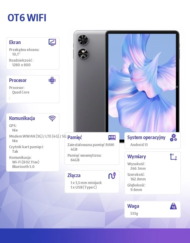Az eszköz ideális utazásokhoz a 533 g alacsony súlyának és kompakt méreteinek köszönhetően. Két kamerával rendelkezik: egy 2 MP-es elülső és egy 5 MP-es hátsó kamerával, melyek alapvető fotózási és videohívási lehetőségeket kínálnak. A modern csatlakoztathatóság, beleértve a Wi-Fi 6 és Bluetooth 5.0-t is, egyszerű csatlakozást biztosít az internethez és más eszközökhöz.