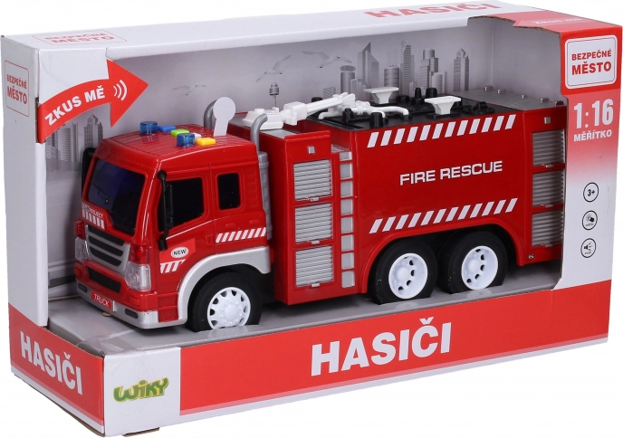 Tűzoltóautó fecskendővel nagyszerű szórakozást kínál a gyerekeknek. A valósághű fény- és hangeffektek és az egyszerű lendkerekes irányítás órákon át tartó játékélményt biztosít a gyerekeknek.