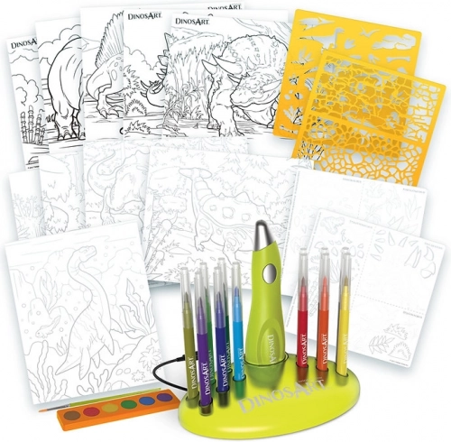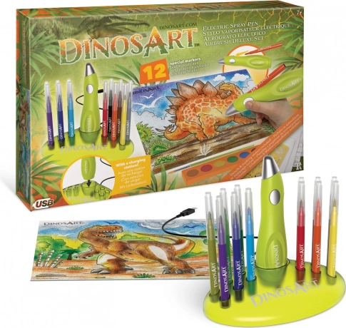 A DinosArt airbrush kifestő készlet ideális minden kis művész számára, aki szereti a dinoszauruszokat és a kreatív szórakozást. A készlet része egy elektromos szórópisztoly, egy USB kábellel ellátott töltőállomás és számos speciális filctoll és akvarell festék.