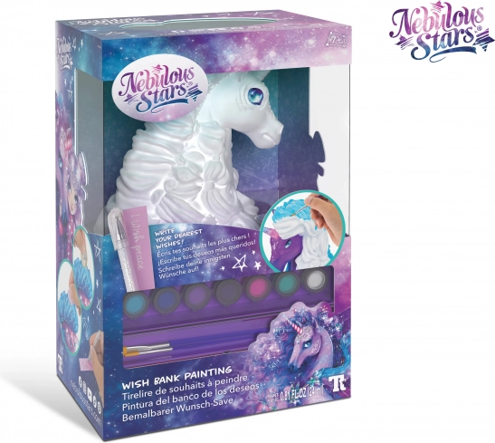 Nebulous Stars kívánságpersely. Készlet: fesd meg a saját kívánságperselyedet. A csomag tartalma – persely, 7 akrilfesték, csillogó lakk, 2 ecset, 75 kövecske, mini zseléstoll, mini napló, útmutató.