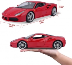 A Bburago modell hűen visszaadja a Ferrari 488 GTB dinamikus vonalait és részleteit elegáns piros színben. A fém karosszériának, a precíz festésnek és a valósághű kerekeknek köszönhetően úgy hat, mint egy igazi autó miniatűrben. A nyitható ajtók, a motorházfedél és a motortér fedele lehetővé teszik a kidolgozott belső tér és a jármű belsejének megtekintését.