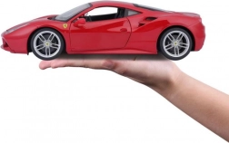 Részletes kivitelű, piros Ferrari 488 GTB autentikus arányokkal, logókkal és sportkerekekkel 1:18 méretarányban.