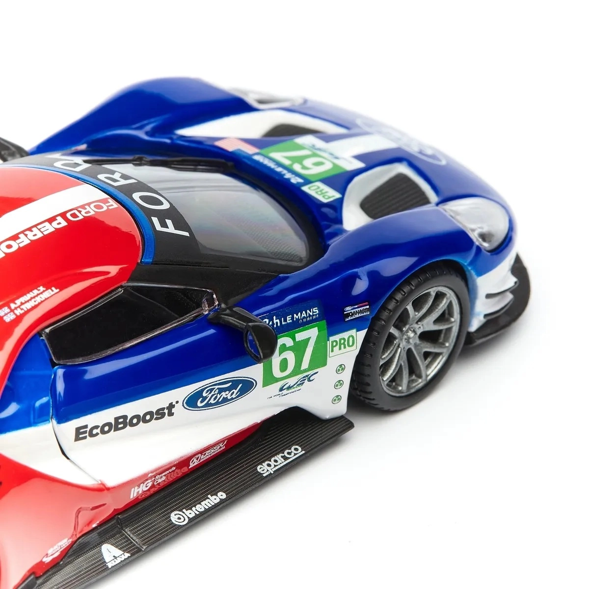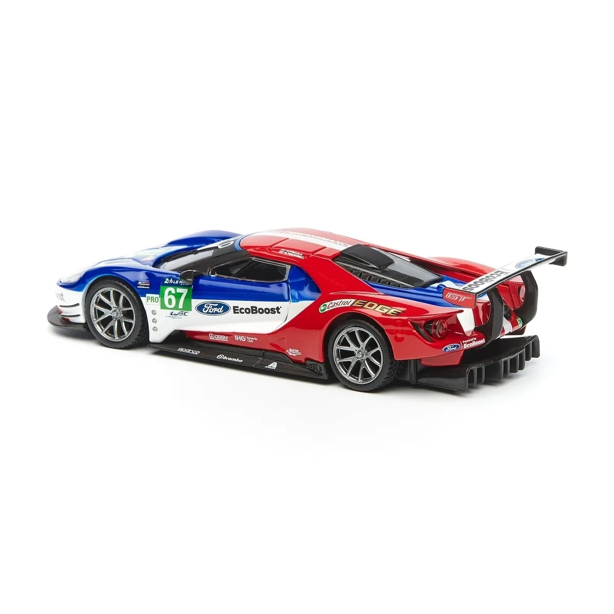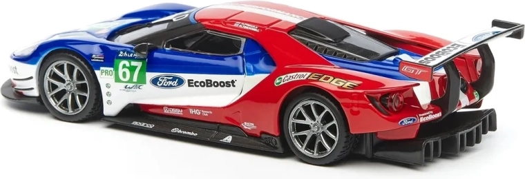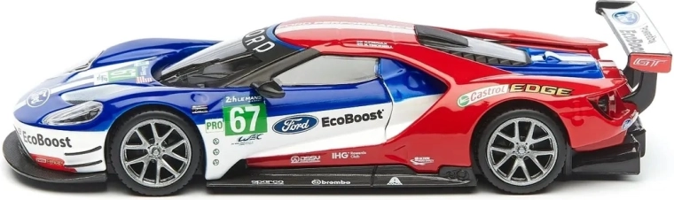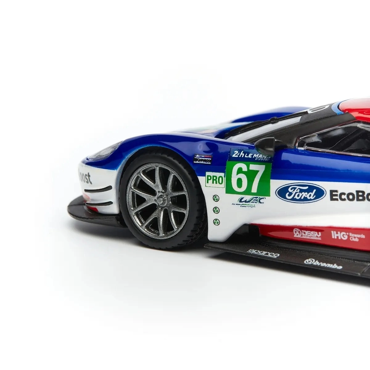 Ez a precíz, fém versenyautó-modell, a FORD GT ikonikus EcoBoost Le Mans #67 festésében remek karosszéria-részleteket, élethű arányokat és minőségi, szponzorlogókkal ellátott nyomtatást kínál. Masszív kivitelének és szabadon forgó kerekeinek köszönhetően ideális kiállításhoz és könnyed játékhoz is.