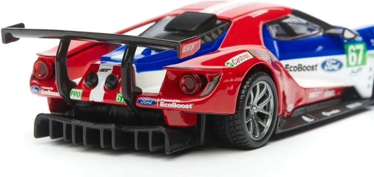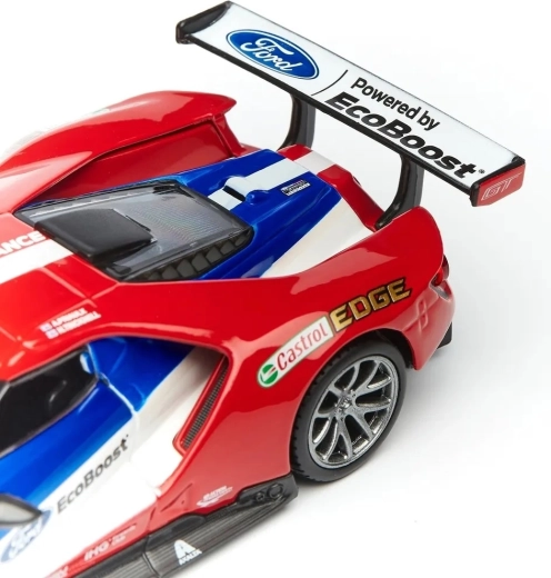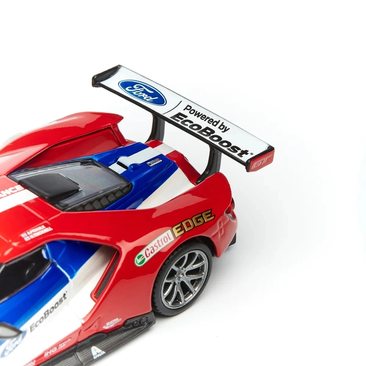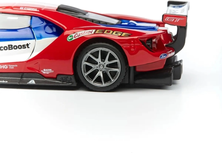 Nagy hátsó szárny, diffúzor és első splitter hűen követik a valódi FORD GT versenygép megoldásait a maximális hitelességért.