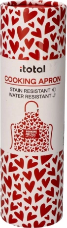 Stílusos konyhai kötény praktikus tubusban, romantikus szívecske mintával. Biztosítja a megbízható ruhavédelmet, könnyen tisztítható, és a tágas zsebnek köszönhetően praktikus tárolóhelyet nyújt kisebb konyhai eszközök számára.