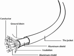 Részletes diagram mutatja a kábel belső szerkezetét, beleértve a vezetőt, szigetelést és védőborítást.