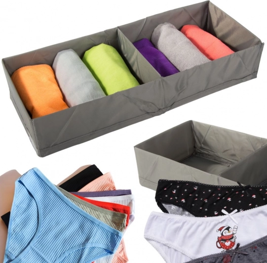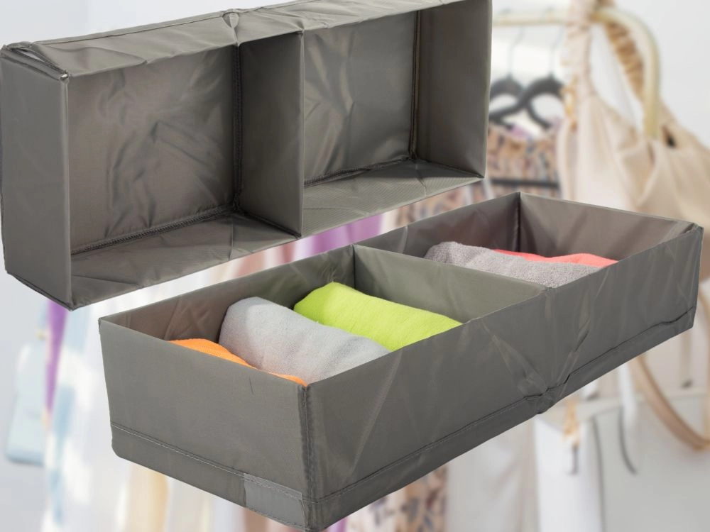 Tegyen rendet a fiókokban pillanatok alatt. Ez a szürke textil rendszerező 2 tágas rekesszel átláthatóan szétválogatva tartja a fehérneműt, zoknikat és kiegészítőket. A könnyű, összehajtható kivitelnek köszönhetően egyszerűen tárolható, a megerősített oldalfalak tartják a formát, a strapabíró poliészter pedig könnyen tisztítható.