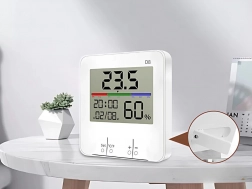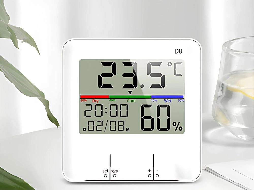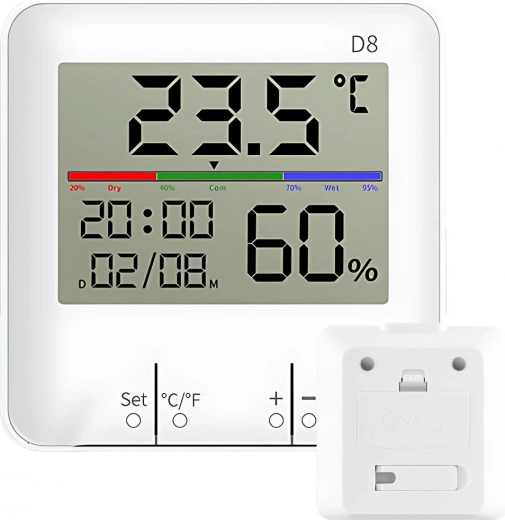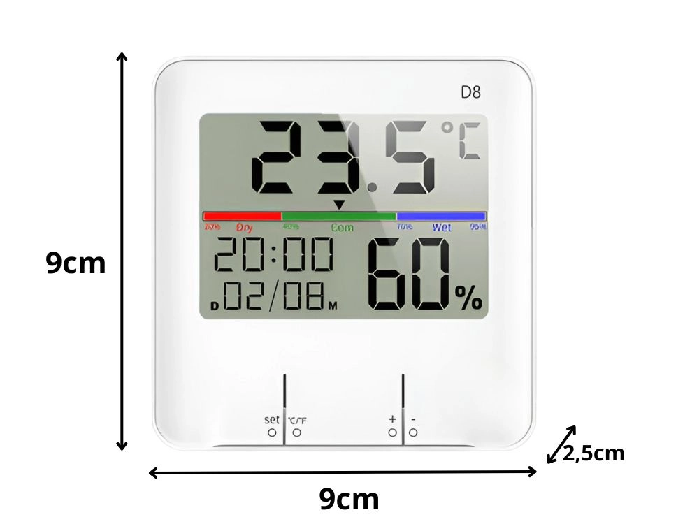 Praktikus digitális beltéri időjárás‑állomás, amely egyetlen áttekinthető LCD kijelzőn egyesíti a hőmérőt, a páramérőt, az órát és a naptárt. Első pillantásra látható a hőmérséklet (°C/°F), a páratartalom, az idő és a dátum, beleértve a színes kényelmi jelzőt a levegő páratartalmához.