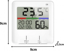 Ez a modern otthoni időjárás‑állomás ideális a nappaliba, hálószobába, gyerekszobába és irodába. A nagy, jól olvasható kijelzőt színes skála egészíti ki, amely áttekinthetően mutatja, hogy a levegő száraz, komfortos vagy túl nedves – kiváló segítség a fűtés vagy a párásító beállításához.
