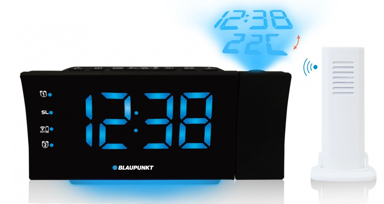A nagy, fényes és fényerő-szabályozható LED kijelző távolról is jól olvasható. A különleges kényelmet a projektor nyújtja, amely az aktuális időt és a kültéri hőmérsékletet vetíti a plafonra vagy a falra. A hőmérséklet-információt a vezeték nélküli kültéri érzékelő szolgáltatja – elég az ablakon kívül elhelyezni.