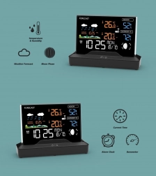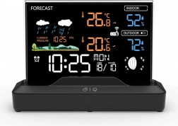 A modern, vezeték nélküli időjárás-állomás színes LCD kijelzővel pontos belső és külső hőmérséklet- és páratartalom-mérést, barométert a légnyomás követéséhez, rádióvezérelt órát ébresztővel, valamint 12–24 órás időjárás-előrejelzést kínál. A 30 m-ig működő vezeték nélküli érzékelőnek és a állítható háttérvilágításnak köszönhetően nappal és éjjel is könnyen leolvashatók az adatok.