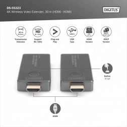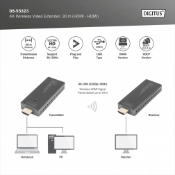 Élvezze a tűéles képet és a tiszta hangot kábelezés nélkül. Ez az adó‑vevő készlet vezeték nélkül továbbítja a HDMI jelet akár 4K/30 Hz felbontásban, legfeljebb 30 méterig (közvetlen rálátás esetén). Ideális laptop, set‑top box vagy lejátszó csatlakoztatásához TV‑hez, projektorhoz vagy monitorhoz.