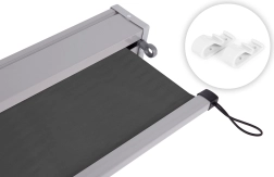 Alsó rögzítés:A mellékelt elemeknek és a napellenző alsó élén található rugalmas pántoknak köszönhetően a kitekert napellenző végei a falhoz rögzíthetők. Ez a funkció különösen szeles időben biztosít stabilitást.
