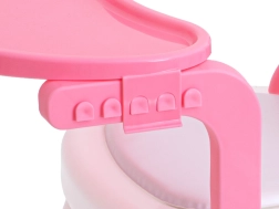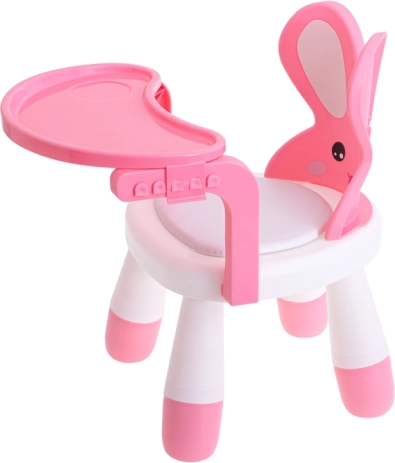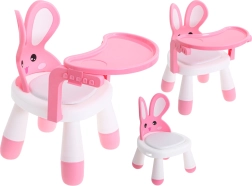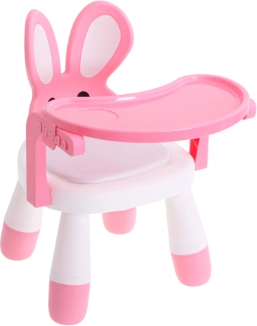 Ez a multifunkciós, nyuszi motívumos gyerekszék kellemes rituálévá varázsolja az étkezést és a játékot. A levehető rózsaszín tálca etetéshez, rajzoláshoz és építőkockázáshoz is használható, míg a füles ergonomikus háttámla támogatja a helyes és kényelmes ülést.