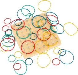 Fedezze fel, hogyan lehet a gyerekeket játékosan megismertetni a matematika alapjaival – formák, szögek és szimmetria. A sűrű tüskehálós falapon a gyerekek különböző hosszúságú és színű gumikat feszítenek ki, és a kártyák alapján vagy saját fantáziájuk szerint alkotnak alakzatokat. A játék fejleszti a kéz–szem koordinációt, a koncentrációt és a logikus gondolkodást.