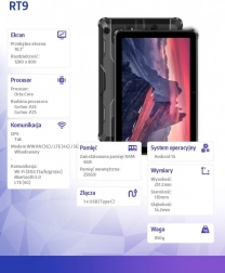 Az Oukitel RT9 tablet egy erős nyolcmagos Unisoc Tiger T606 processzorral van felszerelve, amely 6 GB RAM-mal és 256 GB belső tárhellyel kombinálva sima működést biztosít minden alkalmazás számára és elegendő helyet az adatoknak. A 11 000 mAh-s akkumulátor 48 órás telefonálást vagy 30 órás zenelejátszást tesz lehetővé, és a 18 W gyorstöltéssel gyorsan feltöltődik. A tablet 16 MP elülső és hátsó kamerával rendelkezik, ideális videohívásokhoz és fényképezéshez. Az LTE, Wi-Fi 5 és Bluetooth 5.0 segítségével mindig csatlakoztatott marad, és a beépített GPS-szel könnyen megtalálhatja az utat.