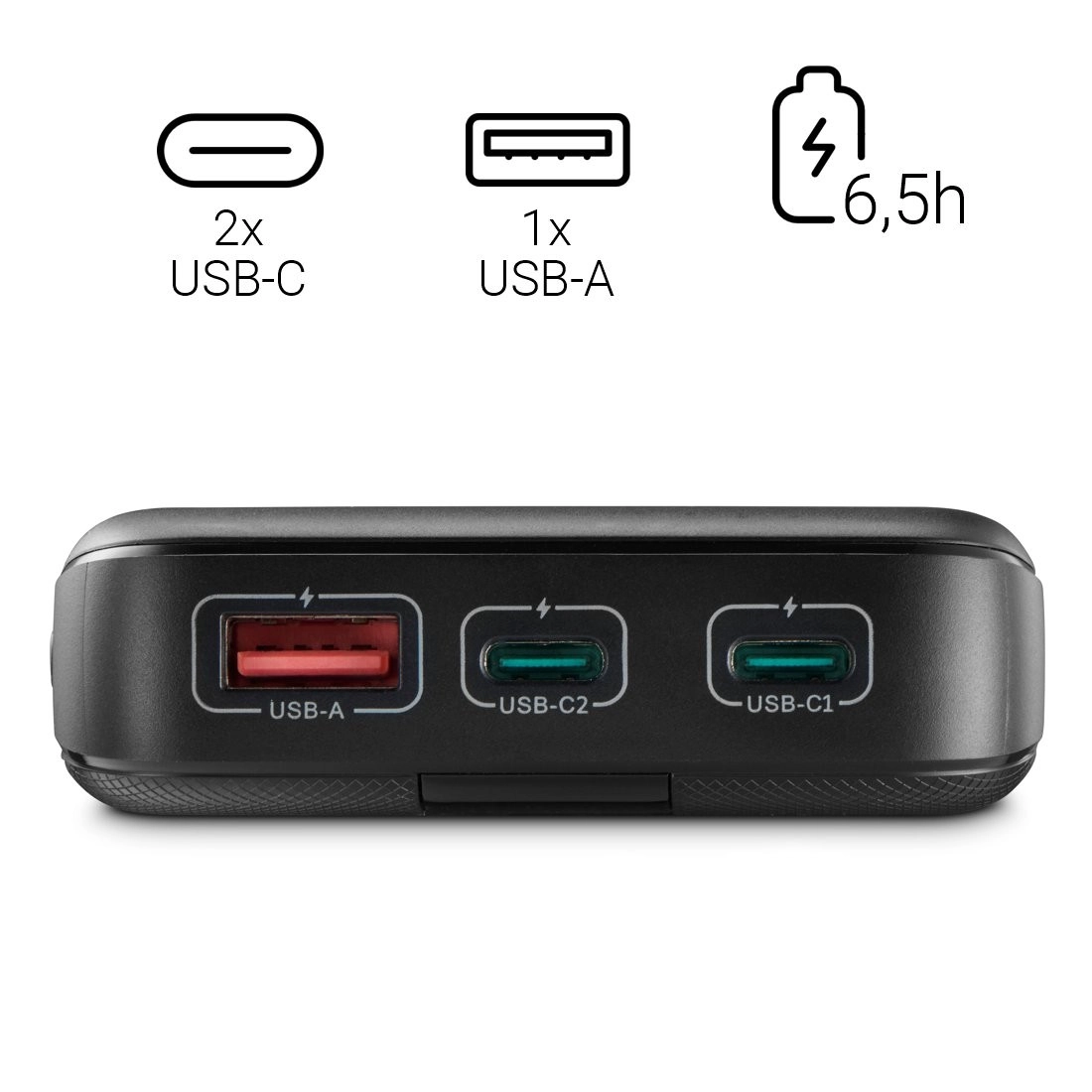 A mi powerbankunk egyszerre három eszköz töltését teszi lehetővé, két USB-C és egy USB-A portnak köszönhetően. Ez azt jelenti, hogy egyszerre tölthet telefont, tabletet és okosórát, ami nagyon praktikus utazáskor vagy egy mozgalmas napon.